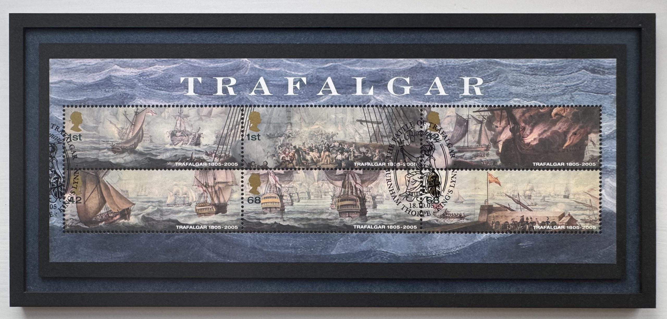 Framed Miniature Sheet, issued in 2005, to commemorate the bicentenary of the Battle of Trafalgar. The stamps feature images from a painting, Panorama of the Battle of Trafalgar, by William Heath (1825), the original of which hangs in the National Maritime Museum in Greenwich. Each stamp measures 60 x 21mm.